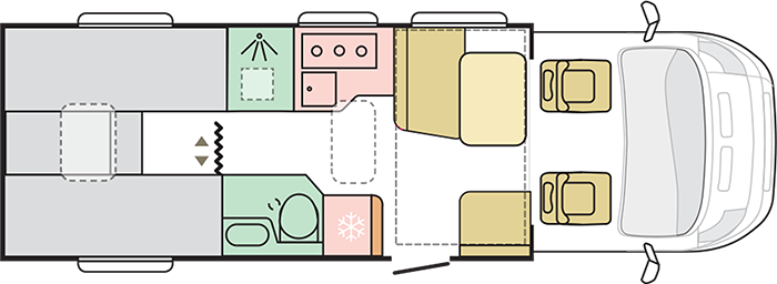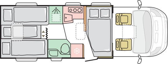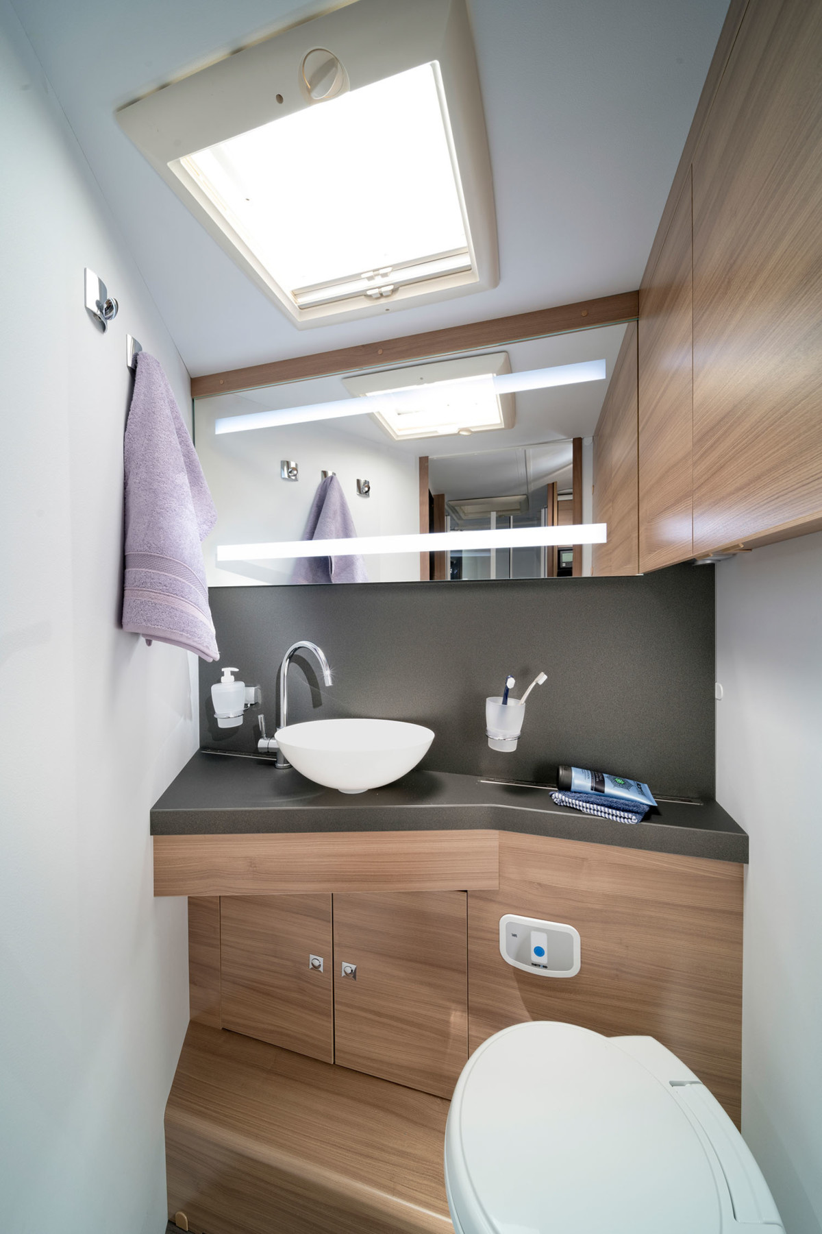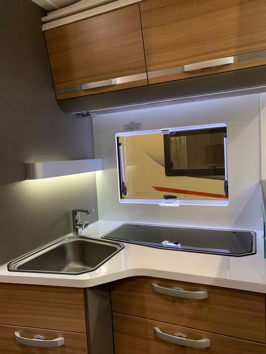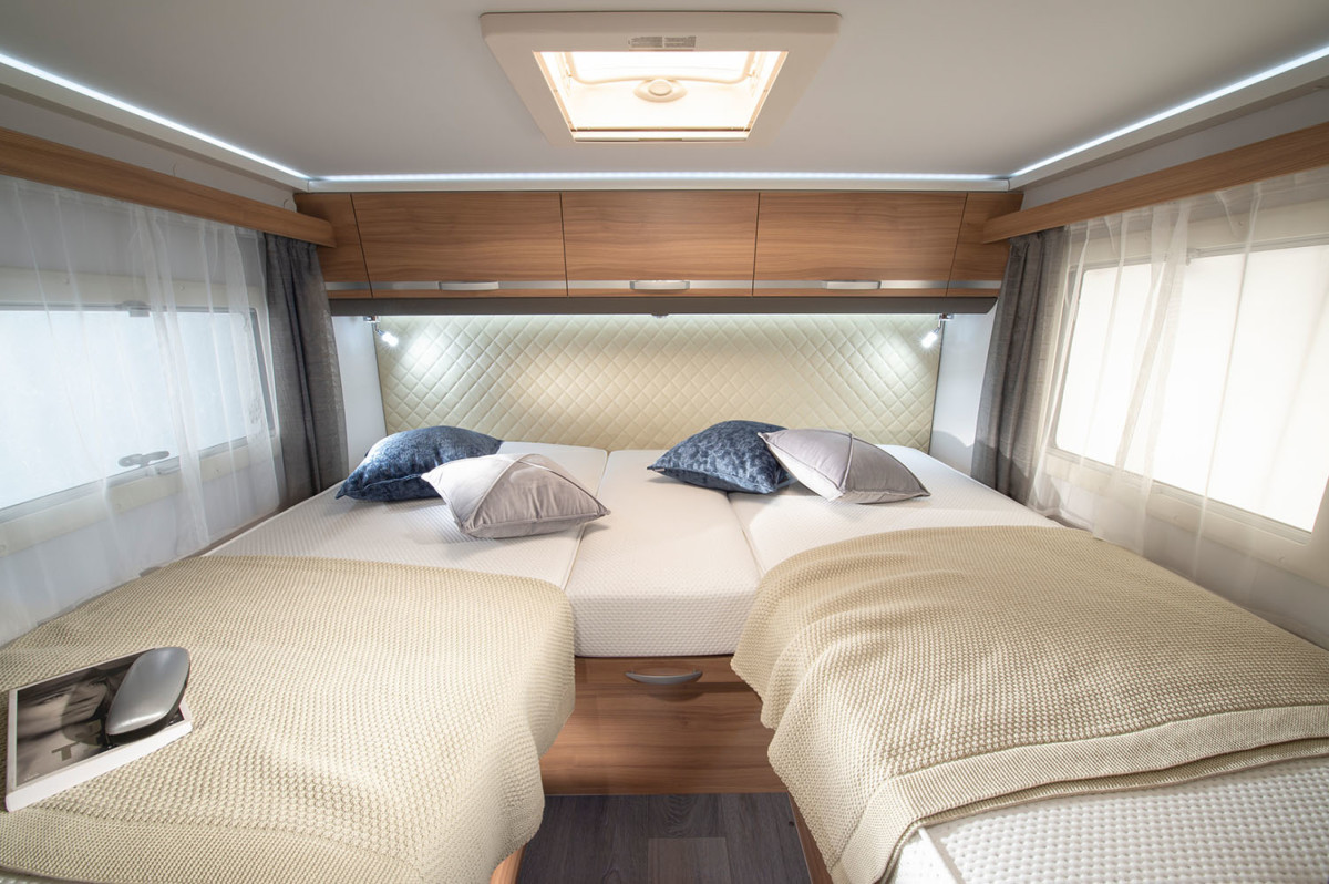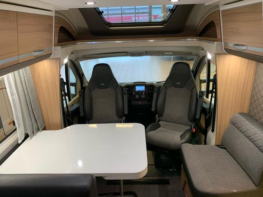 Utrymmena i denna husbil upplevs som välplanerade. Långbäddarna i bak kan enkelt göras om till en större genom att förlänga mittpartiet. Toaletten är rymlig. Duschen kan användas som förvaringsutrymme. Den elmanövererade taksängen gör att man slipper bädda om sittgruppen vid läggdags. Men även denna går att bädda om man önskar detta. Både förarstol och passagerarstol är svängbara och vänds lätt mot sittgruppen. Köksavdelningen finns i mitten, med gasolspis, diskho, köksutrustning för matlagning till 5 personer. Rymligt kylskåp med frysfack. Under långbäddarna finns ett stort förvaringsutrymme. Ett campingbord och campingstolar har sin plats där. Utrustad med cykelställ med plats för högst tre cyklar samt markis. Backkamera. AC i förardelen. Flertalet USB-kontakter. Lättmanövererat vattenburet värmesystem. ALDE värmepanna. Golvvärme. Drift på el & gasol.